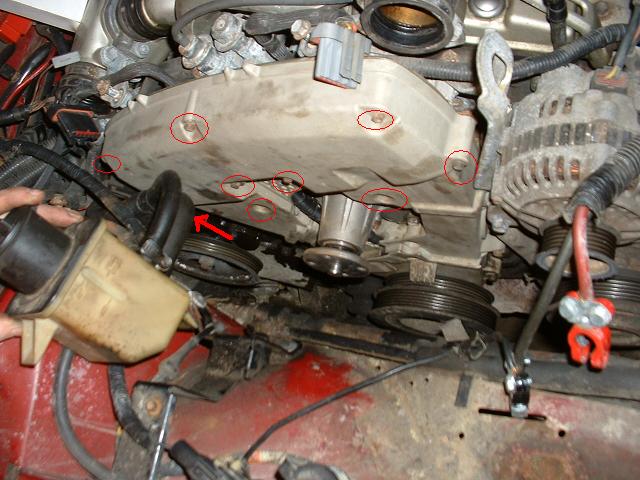 12. Now we can really get into things. Let's remove the upper timing belt cover. There are 9 8mm bolts in a symmetrical pattern. The ninth one is just out of view where the arrow is pointing.